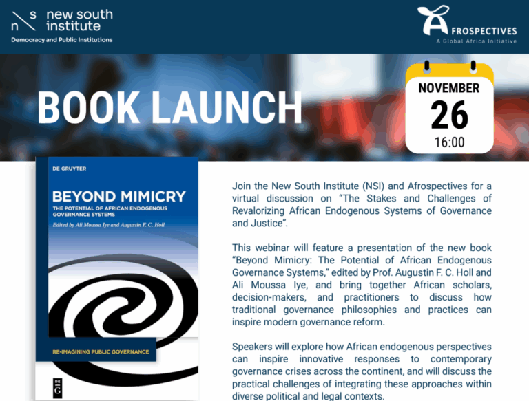 Join the New South Institute (NSI) and Afrospectives for a virtual discussion on “The Stakes and Challenges of Revalorizing African Endogenous Systems of Governanceand Justice”.…